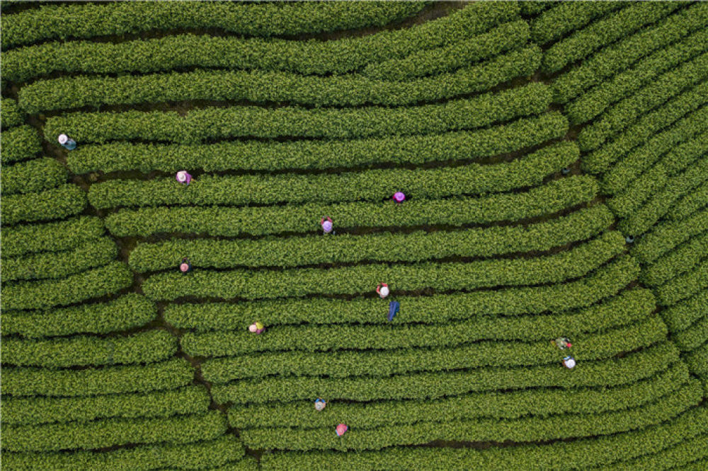 采茶工在浙江省安吉县溪龙乡黄杜村的茶山上采茶(2018年3月24日摄,无人机照片)。新华社记者 黄宗治 摄