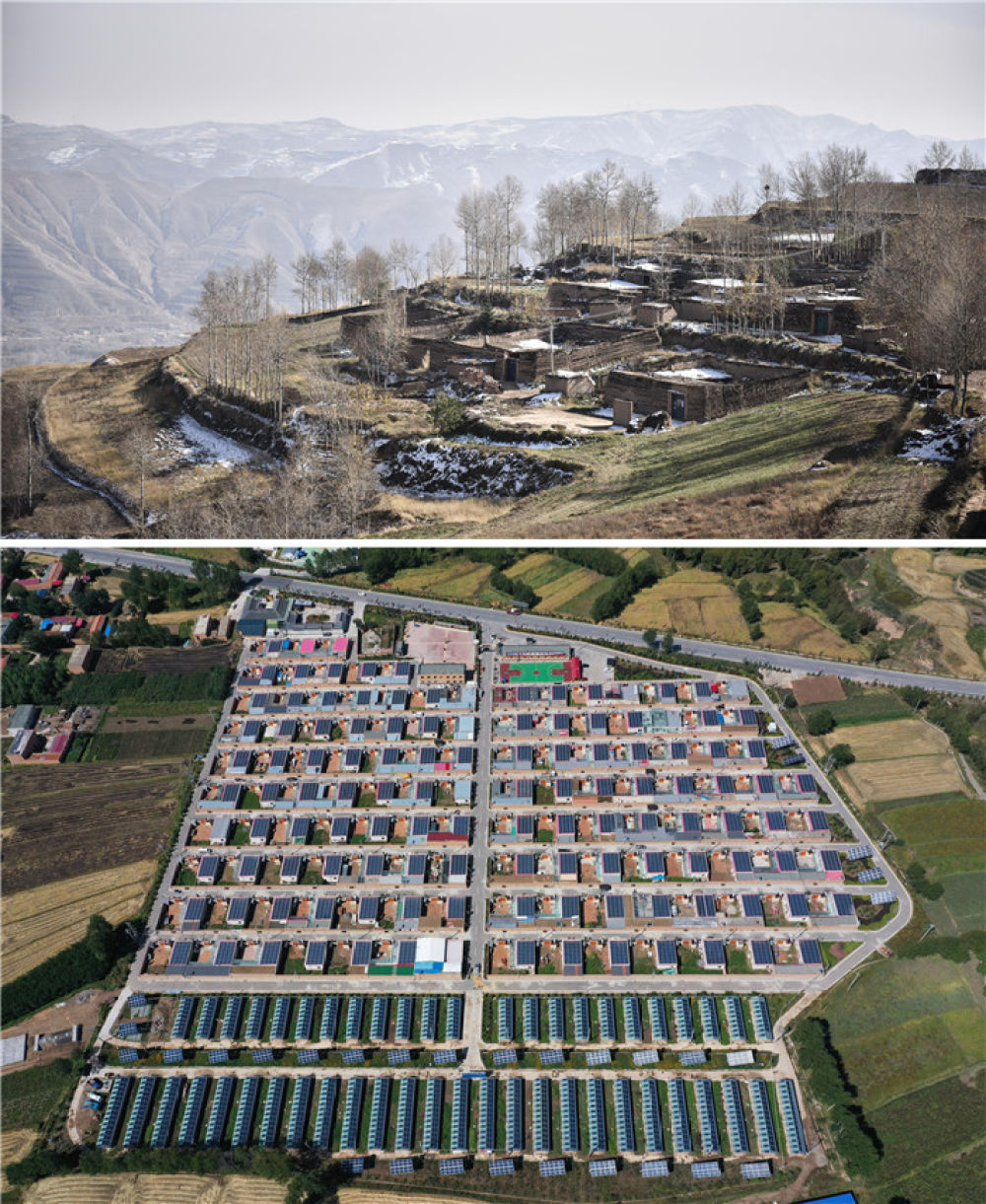 拼版照片:上图为2016年11月拍摄的脱贫前的青海互助土族自治县班彦村村貌(新华社记者吴刚摄,无人机照片);下图为2019年9月拍摄的青海互助土族自治县班彦新村村貌(新华社记者张宏祥摄,无人机照片)。新华社