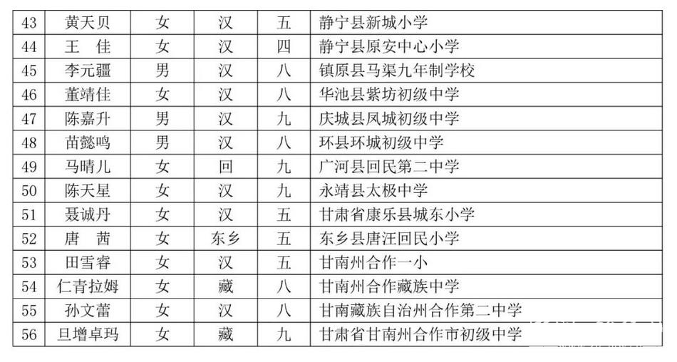 新天水讯 6月19日,教育部官网公布了第十四届宋庆龄奖学金获奖名单。其中,甘肃共有56人入选,他们为中小学生树立了学习榜样。