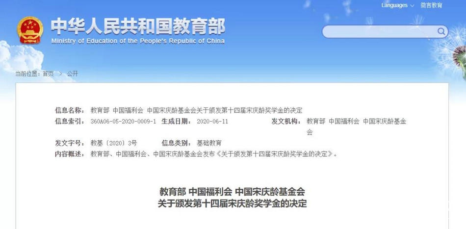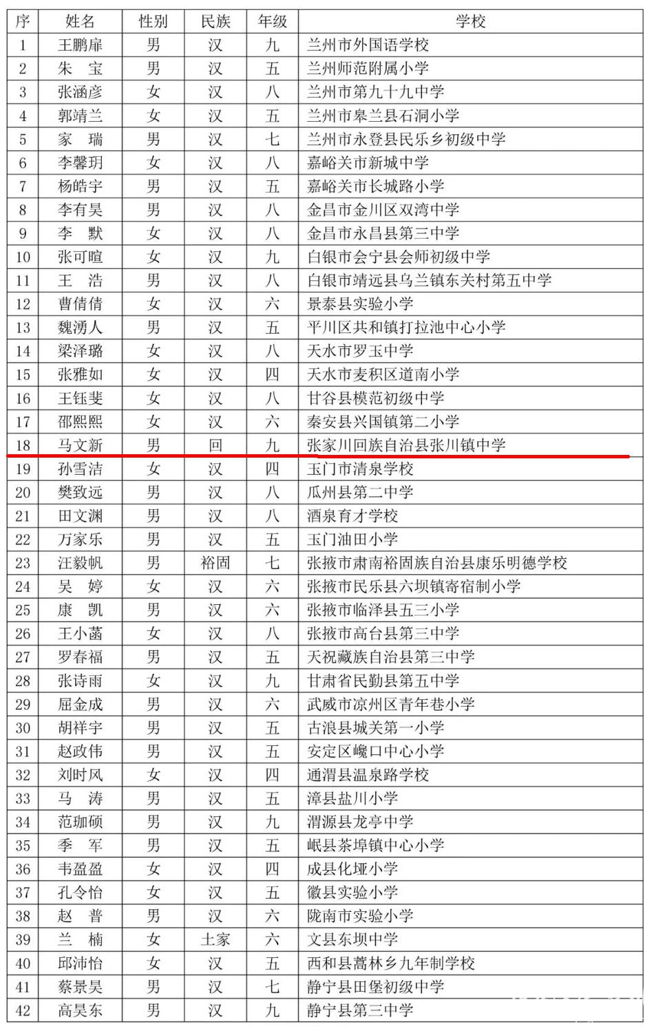 教育部公布 张家川县马文新同学获第十四届宋庆龄奖学金