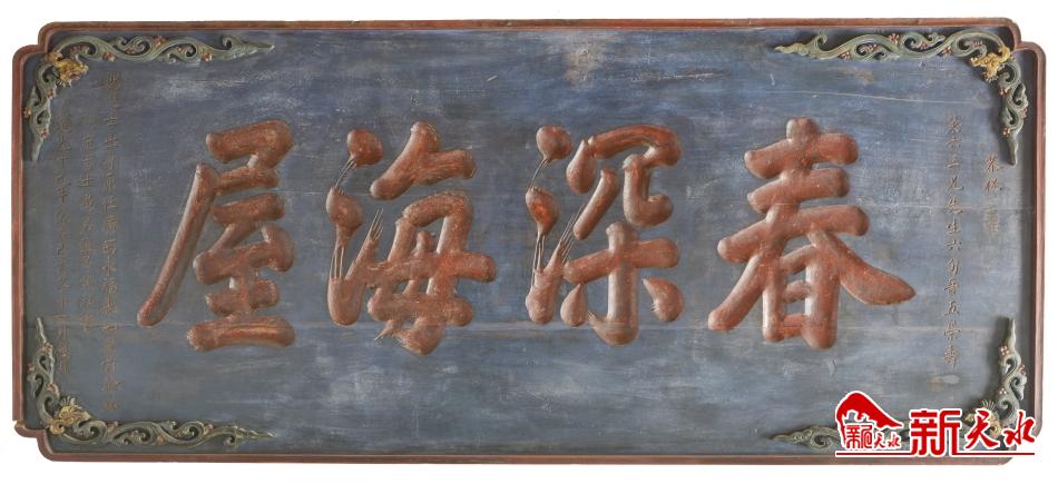 这是一块清代道光年间的匾额,长190厘米,宽82厘米,窄边委角,四角各雕刻变体草叶龙纹,龙身施绿彩,龙头施以金彩,遥相呼应,虽然四角龙纹都是刻好后粘上去的,但至今尚神采依旧。匾额正文为:春深海屋,楷书,蓝底红字;上款:恭祝策六三兄先生六旬晋五荣寿;下款:赐进士出身原任广西永福县知县前翰林院庶吉士愚弟张思诚拜书,道光十九年岁在己亥冬十一月榖旦。
