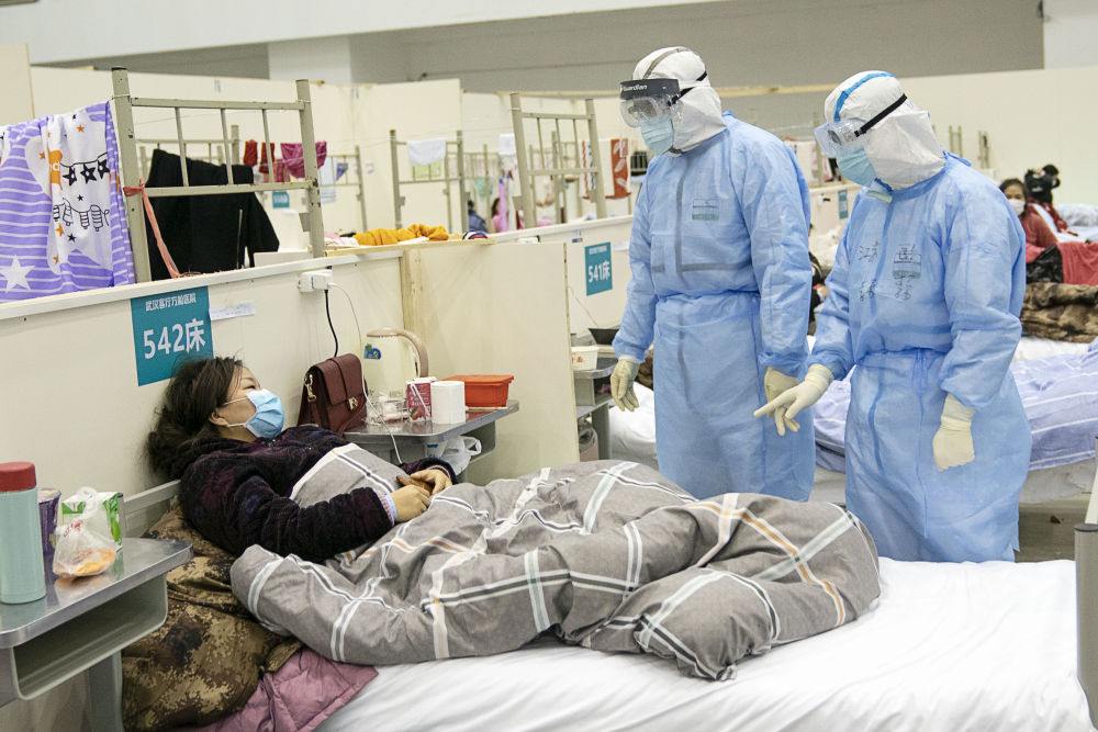 武汉客厅方舱医院医护人员在询问患者病情(新华社记者熊琦摄)