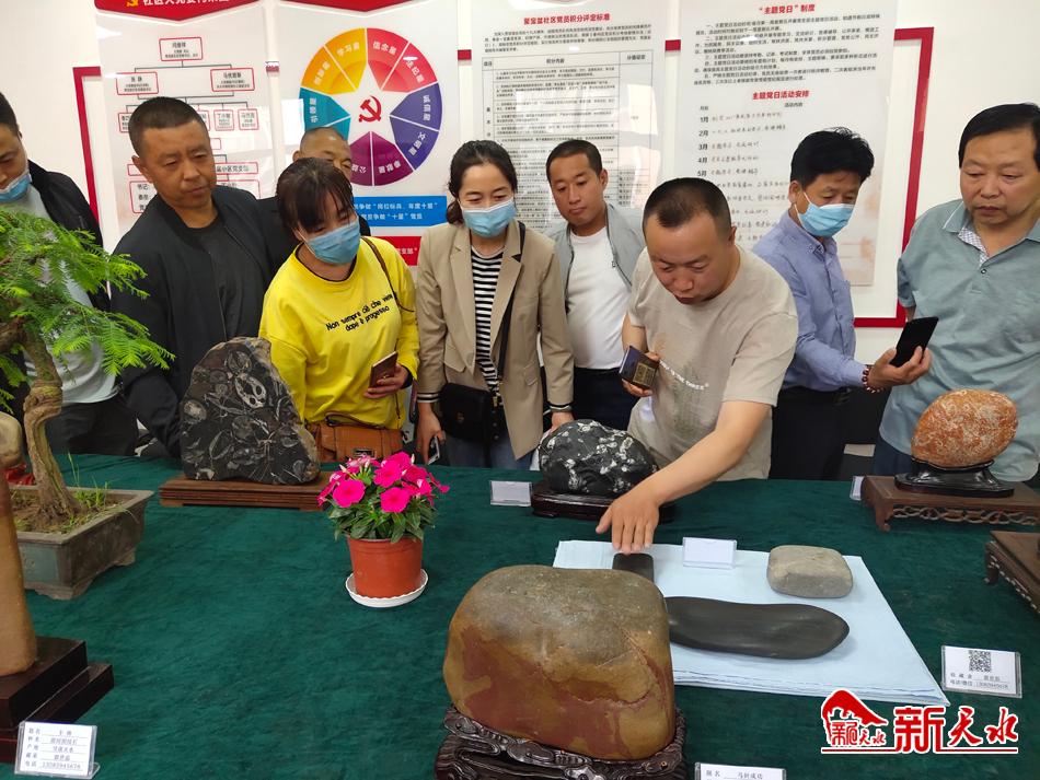 “大家请看,这个乌黑色的石头叫黑金刚,是古人拿来做试金石的,那个是渭河鹦鹉螺化石及珊瑚化石……”一提起石头,在西关街道聚宝盆社区的活动室内,市观赏石协会副秘书长郭世磊便滔滔不绝。他笑着说,他的小名叫石头,是家里人起的,他打小就与石头结下了不解之缘。“天水人对石头有着独特的情结,渭河石艺术的读赏技艺,浓缩了我们天水的地域特色和文化,是一种最古朴而又纯粹原生的文化活动。2014年11月,赏石艺术经国务院批准列入第四批国家级非物质文化遗产名录。最近,渭河石欣赏艺术列入秦州区第五批非物质文化遗产代表性项目。希望通过此次活动,在赏石艺术与群众间搭建起一座交流的桥梁。”