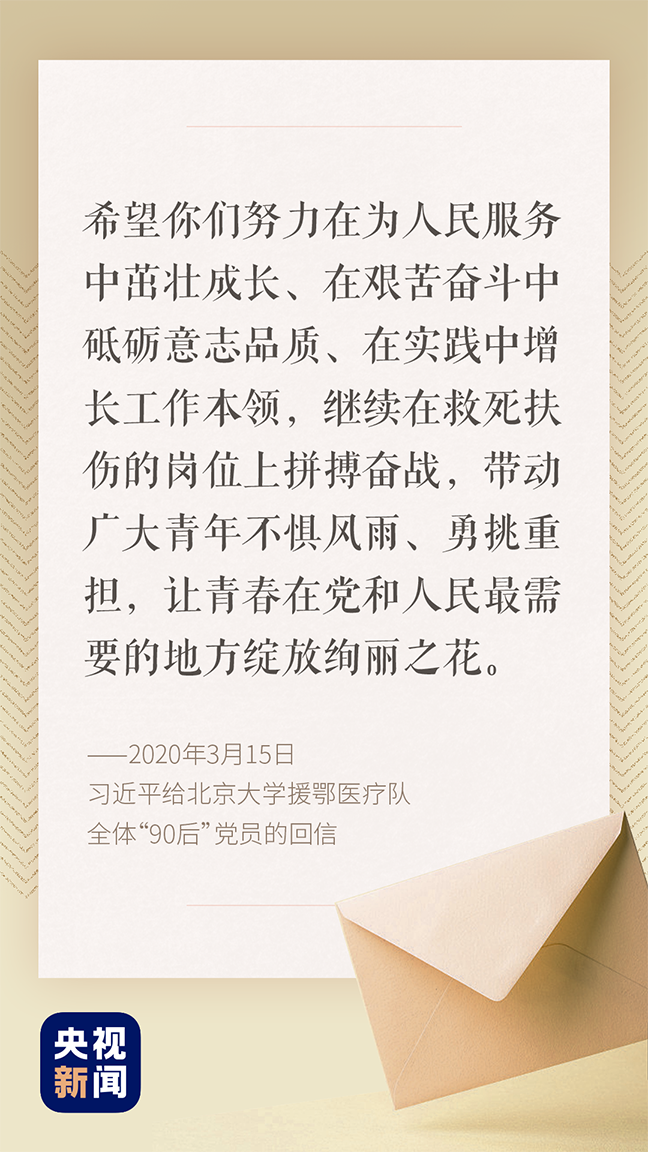 3月15日,习近平总书记给北京大学援鄂医疗队全体“90后”党员回信,向他们和奋斗在疫情防控各条战线上的广大青年致以诚挚的问候。