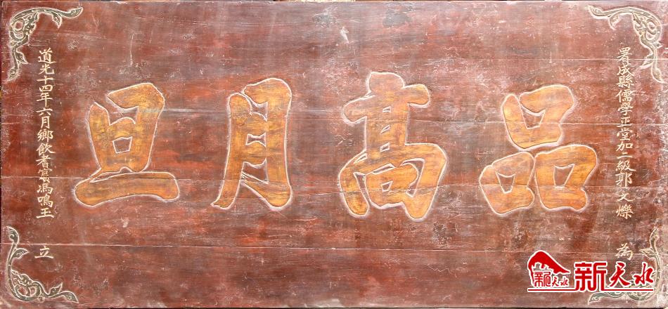 本期赏析天水南宅子清代道光年间的一块匾额,长186厘米,宽86厘米。正文:品高月旦。上款:署成县儒学正堂加二级郭文烁 为;下款:道光十四年六月乡饮耆宾冯鸣玉 立。整匾红底金字,无边,四角雕刻草叶龙纹,行楷书法,阴包阳刻。