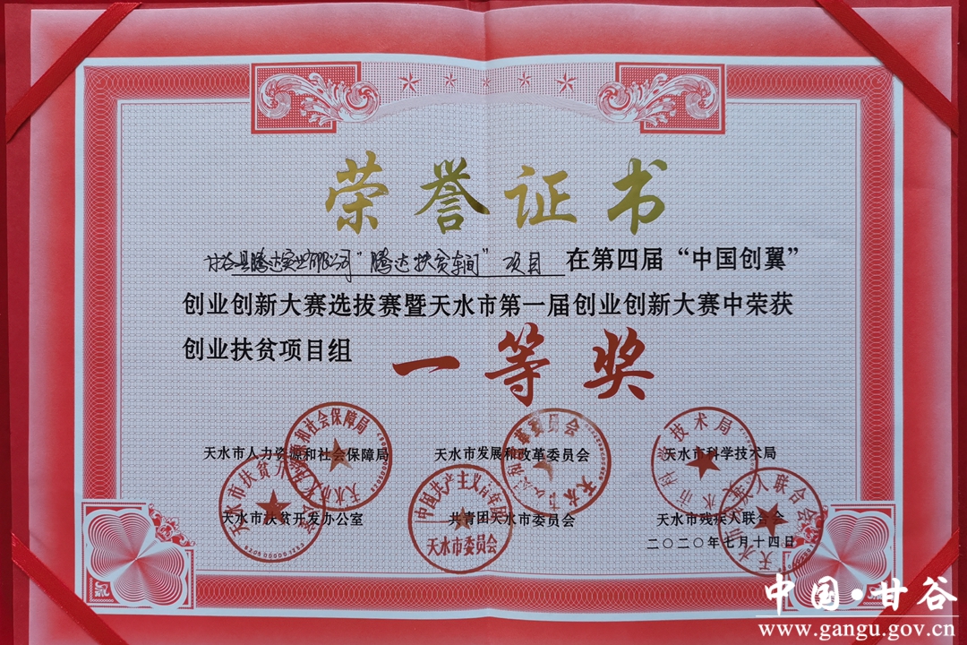 在本届大赛中,甘谷县3个项目获得了优异成绩,其中甘谷县腾达实业有限公司“腾达扶贫车间”项目荣获创业扶贫项目组一等奖,甘肃雅路人麻编工艺制品发展有限公司“雅路人非遗系列产品的开发与推广”项目荣获创新项目组一等奖,天水智能众创科技有限公司“农村双创‘5+1’”项目荣获创业项目组一等奖。