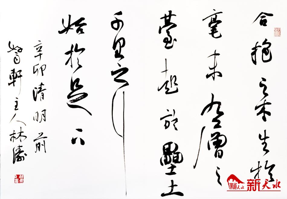 林涛自幼儒雅传家,秉承庭训,学书初取怀素、东坡意趣,又博采宋、明诸家行草格调,其后深植“二王”及魏晋风尚;海上求学之际,幸识胡问遂、周慧珺、瞿心安、张森等书苑名宿,得海派翰墨陶染,并钟情沈氏书学,兼容并蓄而渐得胸次。回归西北桑梓,历陇塬厚土高天、经杏林春雨磨砺,时精研汉魏碑版、简牍、写经墨迹,而得厚重苍茫、雄浑奔放之风致。继而南北融汇,触类旁通,创新以和,终达入古出新,化裁己意之境。其行草凌空取势情态自如,巍然端雅,天然逸出;书风清雅劲健,俊逸率达,笔意从容衍裕而气象超然,尽得“临流可奈清癯,此意平生飞动”之雅致!