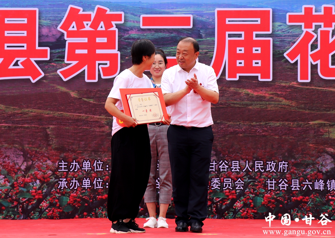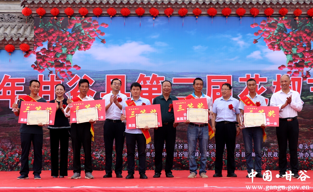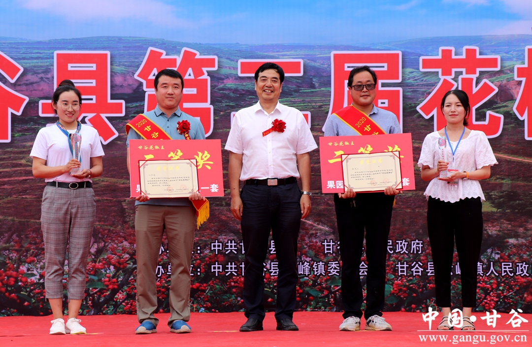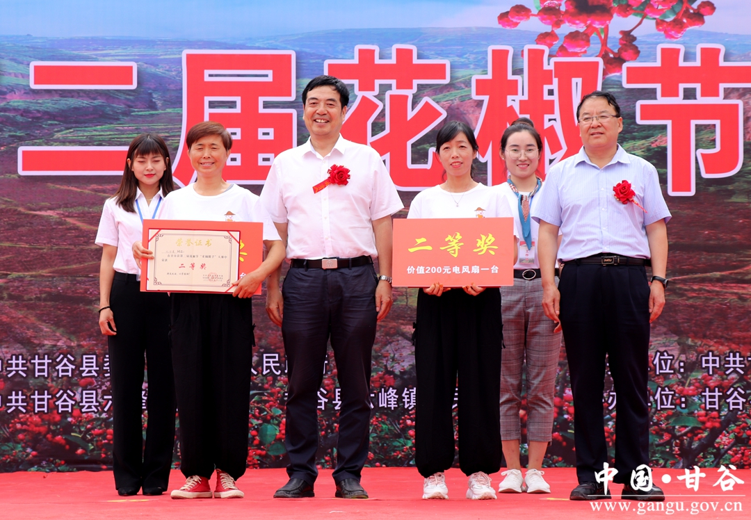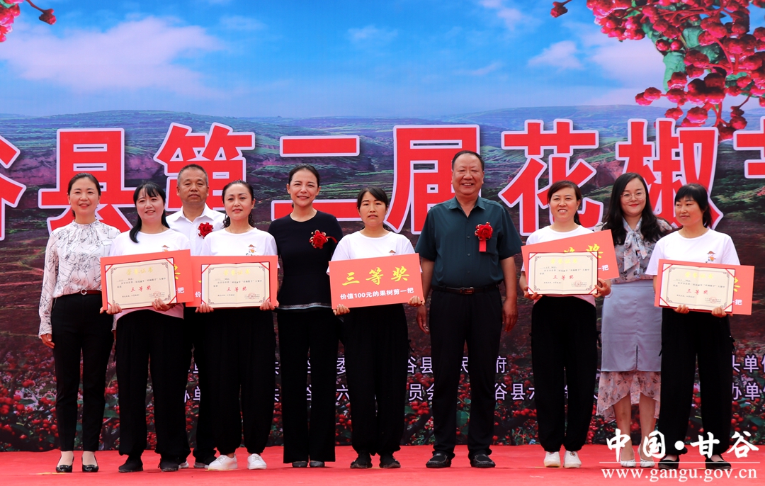 (县委副书记冯伟、县人大常委会副主任王新民、副县长高丽、县政协副主席郭长胜为“甘谷花椒王”评选活动三等奖获奖选手颁奖)