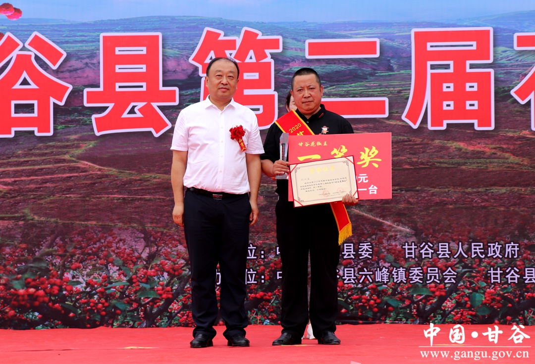 (县人大常委会主任令建民为“甘谷花椒王”评选活动二等奖获奖选手颁奖)