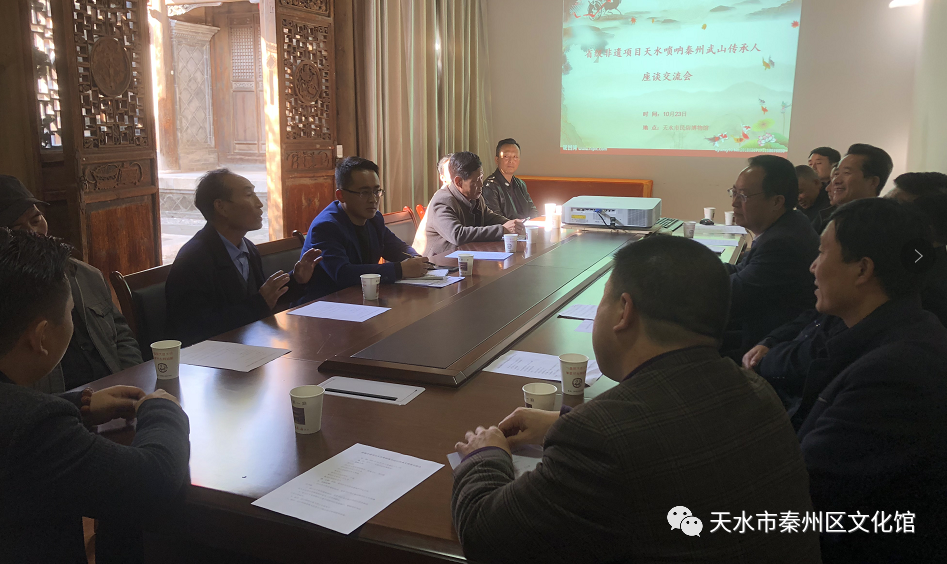 新天水讯 10月23日下午,由秦州区文化馆主办的省级非遗项目天水唢呐秦州武山传承人座谈交流会在南宅子举行,来自秦州区的四名唢呐非遗传承人和武山县的六名唢呐非遗传承人共聚一堂,以座谈交流和展示展演的形式,相互交流切磋唢呐演奏技艺,探讨唢呐保护传承方法途径。