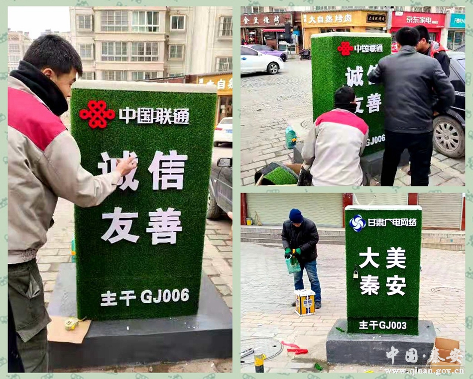 新天水讯 据秦安县融媒体中心消息 为进一步提升城市“颜值”,推进文明城市创建工作,连日来,秦安县综合行政执法局动员组织中国联通、甘肃广电、中国电信等多家单位,对成纪大道、解放路、映南街、滨河路等区域的街边箱体“城市部件”进行了“绿皮”包装,有效改善了市容市貌。