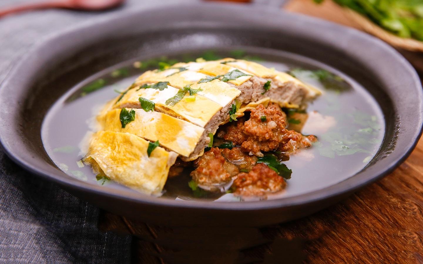 “先把蛋黄和蛋清搅匀,摊成薄饼,取鲜五花肉剁碎,放入盐、粉面、花椒后拌匀,夹在两层薄蛋饼中间压平,上笼蒸熟,切成条形,做成夹板肉,再配以响皮条、丸子、浇上了鸡汤,撒上葱花、木耳、香菜……”