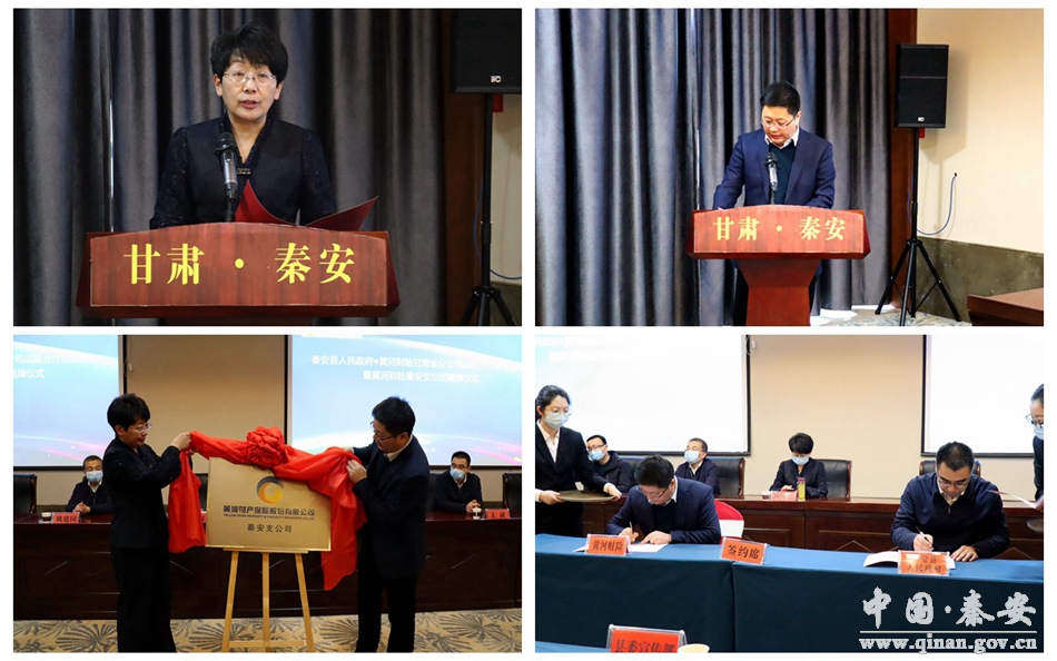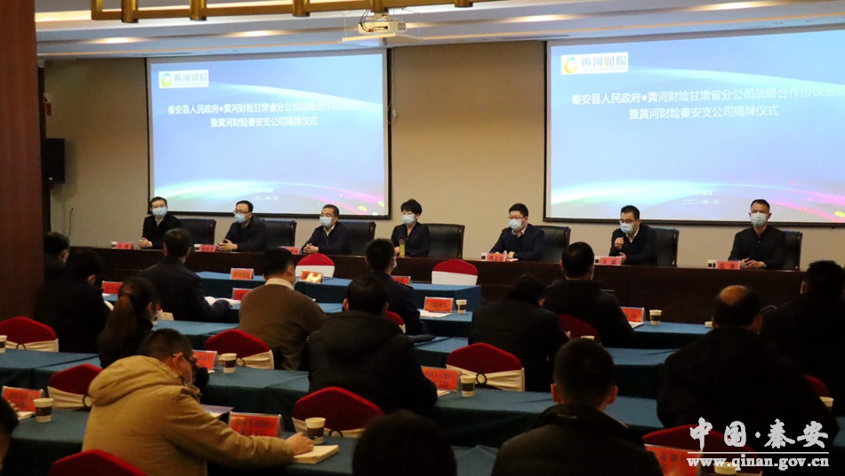 新天水讯 据秦安县融媒体中心消息 1月15日,秦安县人民政府与黄河财险甘肃省分公司战略合作协议签约暨黄河财险秦安支公司揭牌仪式在大地湾印象酒店举行。秦安县委副书记、县长程江芬与黄河财险甘肃省分公司党委委员、纪委书记巩志宏为秦安支公司揭牌;秦安县委常委、常务副县长文斌与黄河财险甘肃省分公司纪委书记巩志宏签署战略合作协议。