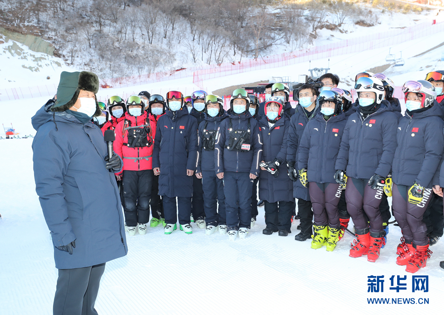 在竞技结束区,习近平观看了中心防护网安装、雪道巡查、运动员救援等赛场保障工作演示和高山滑雪竞技比赛训练情况。习近平指出,安全是重大体育赛事必须坚守的底线。高山滑雪是“勇敢者的运动”,要强化各方面安全保障,抓好管理团队、救护力量和设施维护队伍建设,完善防疫、防火、防事故等风险防范措施,加强应急演练,确保万无一失。希望大家科学训练,注意安全,保重身体,提高水平,发挥在“家门口”参赛优势,争取在高山滑雪项目上实现奖牌零的突破。