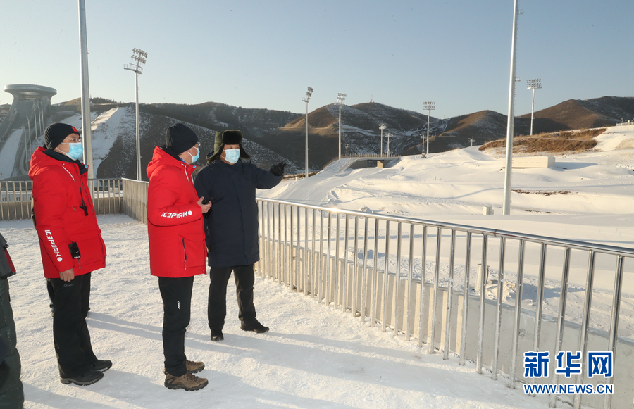 1月18日至20日,中共中央总书记、国家主席、中央军委主席习近平在北京、河北考察,并主持召开北京2022年冬奥会和冬残奥会筹办工作汇报会。这是19日下午,习近平在张家口赛区国家跳台滑雪中心考察调研。 新华社记者 鞠鹏 摄