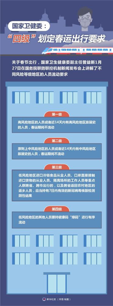 新华社北京1月27日电(记者王琳琳、彭韵佳)关于春节出行,国家卫生健康委副主任曾益新27日在国务院联防联控机制新闻发布会上讲解了不同风险等级地区的人员流动要求。