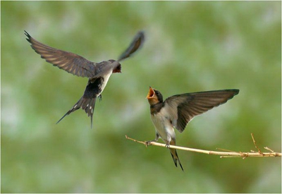 春天,燕子们争相展示优美的舞姿,感受着春光的爱抚和生活的乐趣。它们与人和睦相处,捕食昆虫,保护农作物,守候农家的收成。秋天来了,又要带领子女跋山涉水、长途旅行,抵抗暴风雨的淫威和烈日的曝晒,甚至耗尽生命。因而更懂得珍惜生活,一旦安顿下来,总是恩爱和睦,小燕子享受着长辈无限的疼爱。燕子从南方回来不久,小燕子就降生了。这时的老燕子异常勤快,忙着捉来各种活蹦乱跳的小虫子。老燕子刚飞进屋,那小燕子就张开黄黄的小嘴,喳喳地叫喊争抢。小燕子吃饱了就开始撒娇,头在老燕子身上拱来拱去,然后安静地睡觉。小燕子渐渐长大了,应当学飞了。记得有一只小燕子胆子特别小,别的兄弟姐妹都会外出觅食了,而它仍然胆怯地叫着,扑棱着翅膀就是不敢从巢里往外飞。燕子妈妈急了,一翅膀把它打出了燕巢。谁料这只小燕子忽忽悠悠地飞了几下,掉在了我家堂屋的地上。这时小燕子急了,咧着嘴大声惊叫着,恳求妈妈解救。老燕子担心孩子受到意外伤害,惊恐万状,那叫声近乎凄惨和绝望,一边在屋里七上八下地翻飞着、示范着,一边急切地催促着、鼓励着,竟几次想把小燕子叼起来。小燕子急中生智,扑棱了几下翅膀,歪歪扭扭地飞到了院子里、落到树上。小燕子没有责怪妈妈,反而兴高采烈地唱着、跳着,那分明在说:多亏妈妈一翅膀,才让自己长大,学会了飞翔。老燕子见小燕子有惊无险,欣慰中又透出一分难割难舍。小燕子的飞翔和独立,是老燕子的殷切期望,也是脱离家庭、走向独立的开始。燕子们就是这样在爱与恨、聚与散、生与死之间一辈辈承传和繁衍。