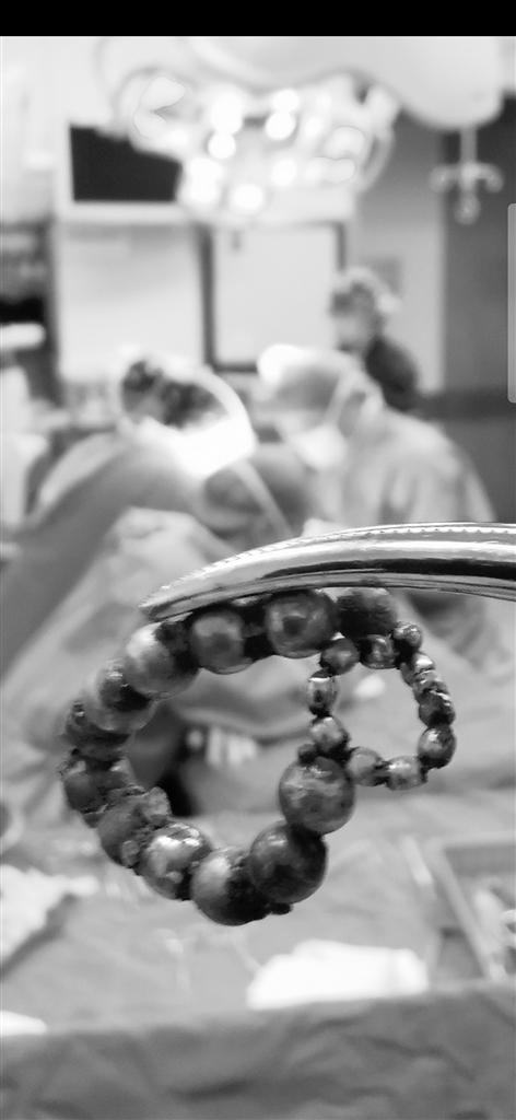“经结肠镜探查,明确异物位置后,随即行剖腹探查、消化道异物取出术。”参与救治的一名大夫说,术中共取出22颗磁力珠,磁力珠相互吸引,相连形成闭合圆环。圆环贯穿游走于多段肠管及其系膜,共计4处肠壁穿孔,2处肠系膜穿孔。