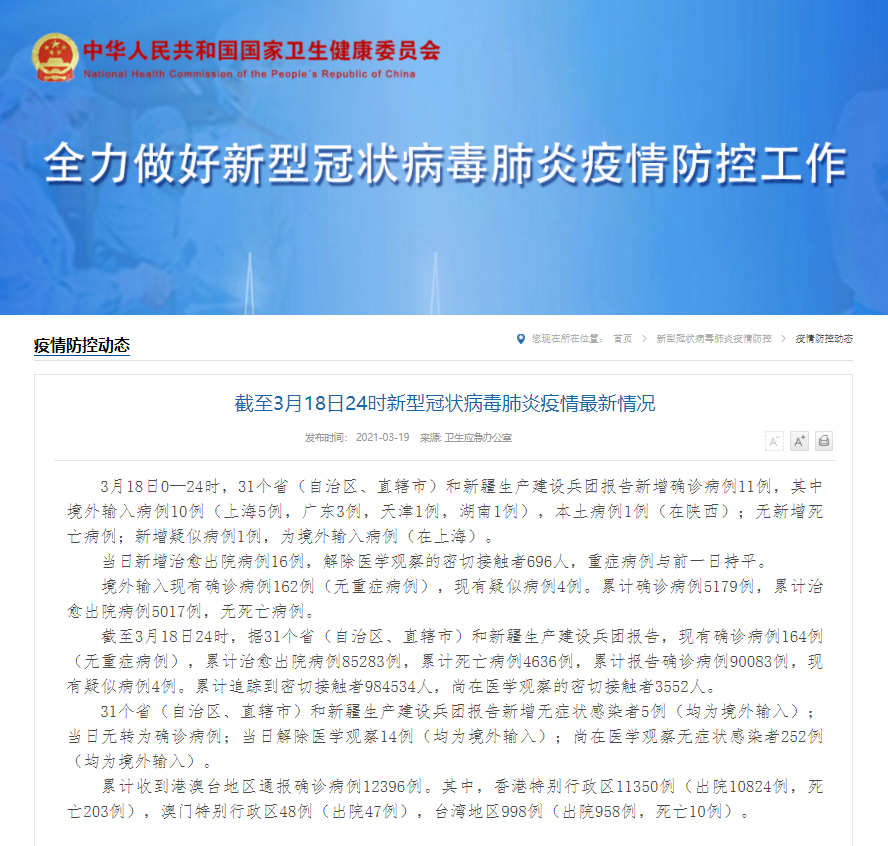 3月18日0—24时,31个省(自治区、直辖市)和新疆生产建设兵团报告新增确诊病例11例,其中境外输入病例10例(上海5例,广东3例,天津1例,湖南1例),本土病例1例(在陕西);无新增死亡病例;新增疑似病例1例,为境外输入病例(在上海)。