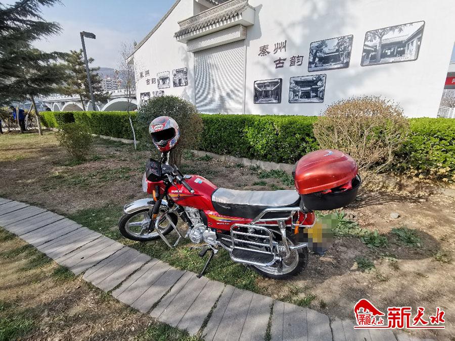 3月24日,有市民把摩托车停放在天水湖莲亭大桥附近,此举破坏草木生长,有损城市形象。(夏雨 摄)