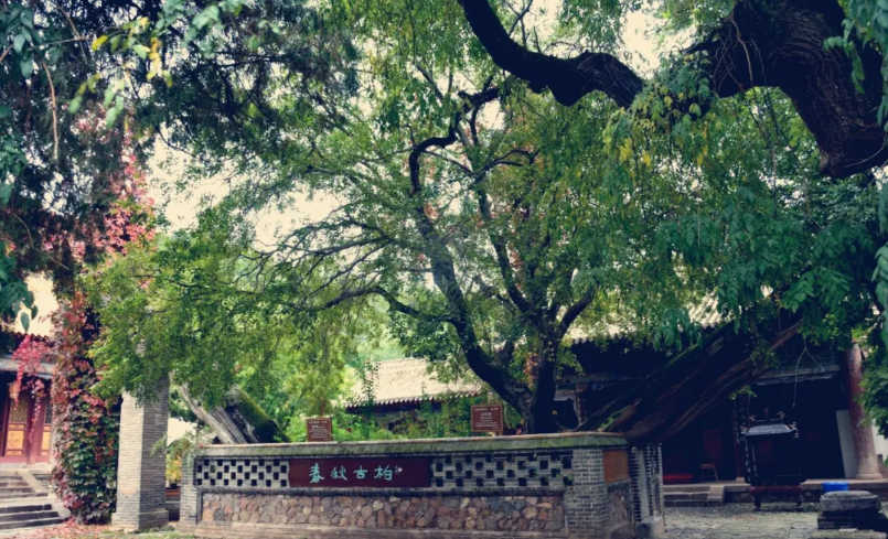平时的夜晚,寺门紧闭,今夜却半开着,似乎在专门等待着我的光临。进入寺门,来到寺院中庭,一棵更古老的柏树出现在眼前。公元759年秋,诗圣杜甫来到天水南郭寺的时候,古柏已是一棵古树了。他的《秦州杂诗》中的“山头南郭寺,水号北流泉。老树空庭得,清渠一邑传。”所写的古树,就是这棵。古柏与孔子同时代,已有二千五百年的树龄。更神奇的是后来那树被沉重的岁月一分为三,一干向南,另外两干向北倾斜,倾向南面的几乎连树皮都没了,却还郁郁葱葱地生长着。一轮明月,似乎是天空奖给古柏的一枚银亮的勋章,静静地挂于枝头。面对古柏,我的血液里注进神力似的,滋生了一种向上的力量。