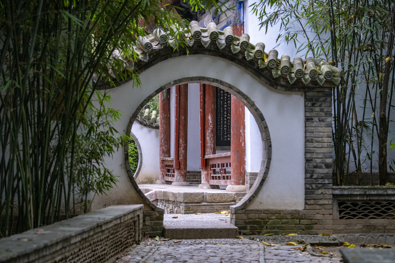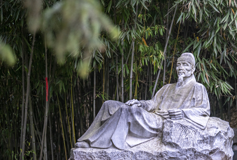游完寺院中庭,不由来到了南郭寺东面竹林茂密的一角,那是我常去的地方。那儿有一尊杜甫的大理石雕像。月下的诗圣,背对竹林,斜坐在巨石上,望着那古柏,似乎在吟:“山头南郭寺……”同时,右手的食指轻扣,和着诗的节律。诗人清瘦的脸上,一脸静穆,胡须微微东斜,预示着拂面而来的是寒冷的西风。从他深邃的眼神,从他被风吹动的胡须,从他微动的食指,能真切地感受到诗人忧国忧民的内心世界。当年杜甫流落秦州,也许那棵古柏激发了他,他才诗如泉涌,短短的三个月写下了百余首诗,载入诗歌的史册。秦州一行,是他诗歌的分水岭,他从一个杰出的诗人升华为一个伟大的诗人。我忽然醒悟,为什么海拔并不高的南郭寺赢得了“第一山”的美誉,原来它是一座诗歌的高地啊!是杜甫提升了南郭寺,还是南郭寺让杜甫有了高度,我想诗圣自己也说不清吧。但我敢肯定的是,诗圣离开时,手里多了一根精神的拐杖——那棵深扎泥土的春秋古柏,他拄着它,一步步走向了世人仰望的星空,成了一颗烛照我们心灵的巨星。