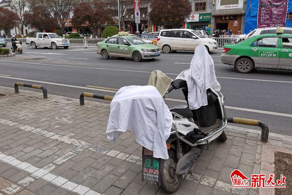 4月7日,在秦州区新华路,有市民把衣服晾晒在电动车上,影响市容。(新天水记者 夏雨 摄)