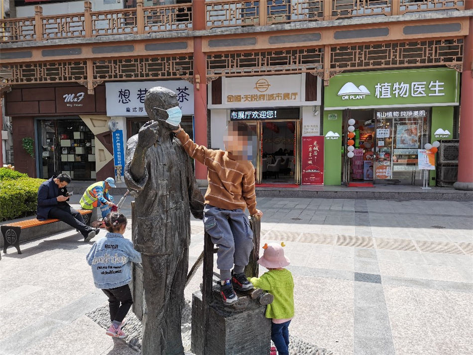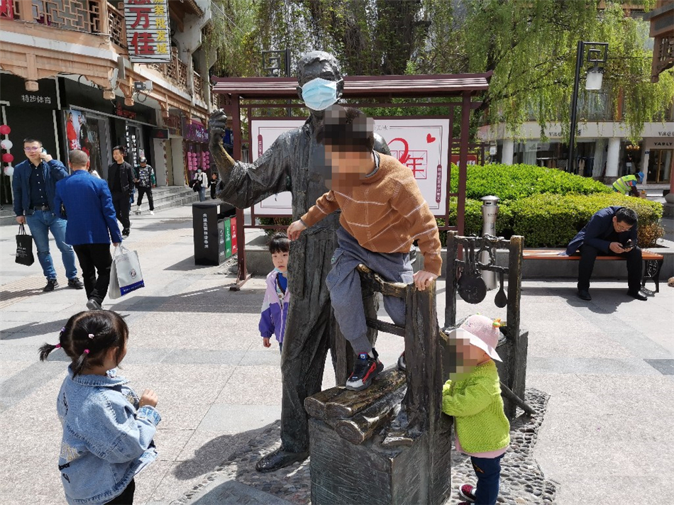 4月16日,在秦州区中华西路步行街,一孩子攀爬在雕塑上,看护孩子的家长在旁边也没制止其行为。文明出行,需要相关部门的宣传引导,更需要每一位家长增强文明意识,引导孩子文明出游。