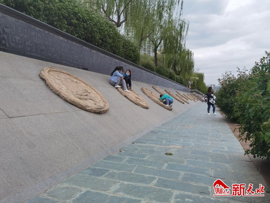 4月18日,在秦州区藉河风情线天水市中医医院附近,几位小朋友或坐在浮雕上,或在浮雕上攀爬,此举既不安全也有失文明。(□新天水记者 冰帆 摄)
