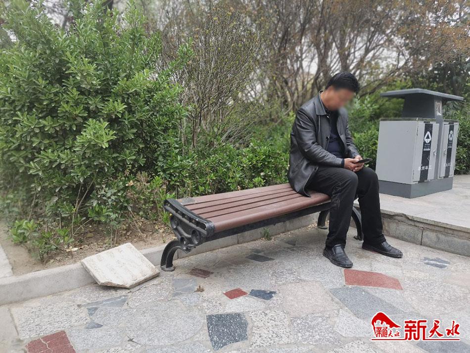 4月21日,在秦州区建三小学对面,路边供市民休息的公共座椅少了“一条腿”,存在安全隐患,望相关部门尽快修理。(新天水记者 夏雨 摄)