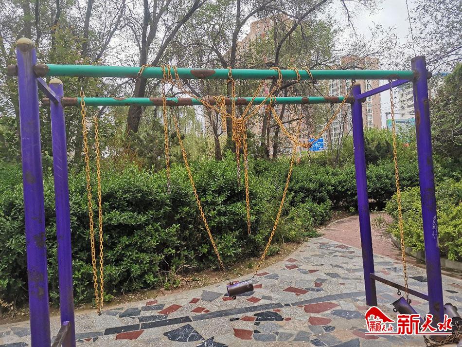 4月22日下午,在秦州区建三小学对面,有一体育器材“伤痕累累”,存在安全隐患,而且影响市容市貌。(新天水记者 夏雨 摄)