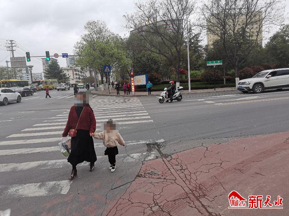 4月21日,在秦州区岷玉路至东桥头的十字路口,一位领着孩子的女士直接闯红灯过马路,让人为她们捏了一把汗。(新天水记者 夏雨 摄)