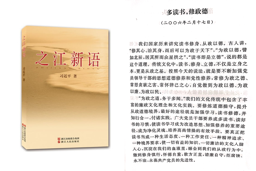 2006年2月17日,时任浙江省委书记的习近平用笔名“哲欣”在《浙江日报》“之江新语”专栏发表题为《多读书,修政德》的文章。他说,我们国家历来讲究读书修身、从政以德。广大党员干部要养成多读书、读好书的习惯,使读书学习成为改造思想、加强修养的重要途径,成为净化灵魂、培养高尚情操的有效手段。