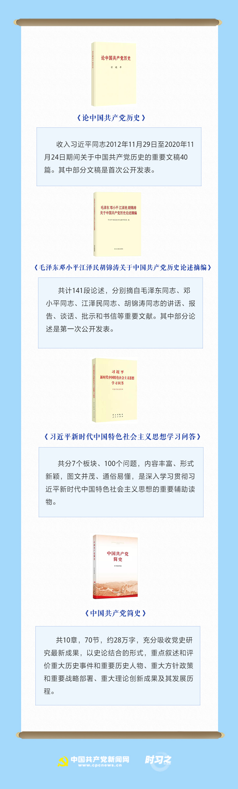 百年恰是风华正茂。鉴往知来,更要从书中汲取养分,以史为镜、以史明志。3月15日,党史学习教育用书出版座谈会暨专题宣讲动员会召开。四本图书加入了学习“书单”——习近平《论中国共产党历史》《毛泽东、邓小平、江泽民、胡锦涛关于中国共产党历史论述摘编》《习近平新时代中国特色社会主义思想学习问答》《中国共产党简史》。