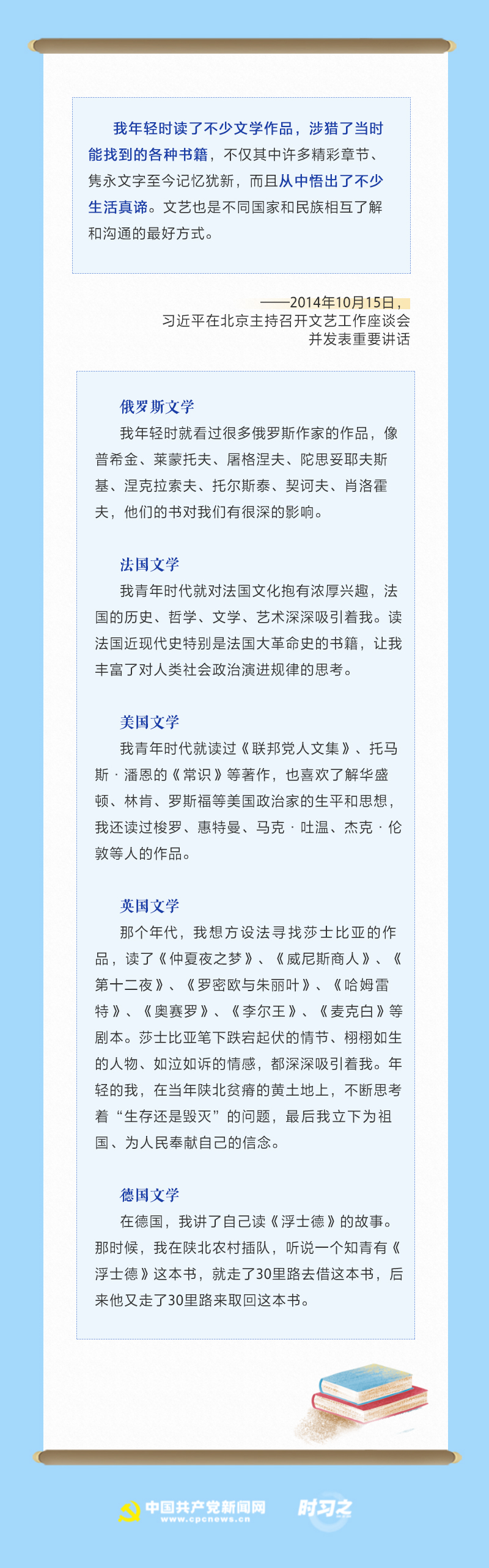习近平经常引用《论语》《史记》《春秋》《汉书》《战国策》等中华优秀传统文化经典,可见其对中国文学涉猎广泛,除此之外,习近平也阅读了大量外国文学经典。
