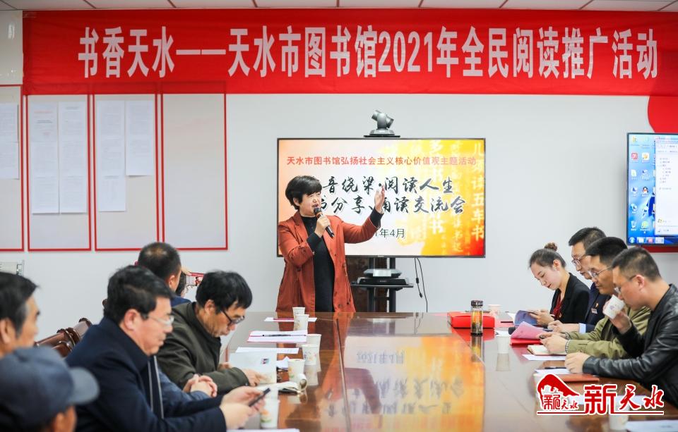新天水讯【记者 刘蕾】为开展全民阅读活动,推动书香天水,4月23日下午3时,天水市图书馆“阅百年历程 传精神力量”2021年全民阅读活动启动仪式暨“余音绕梁 阅读人生”图书分享、诵读交流会在市图书馆三楼会议室举行,天水市知名作家、市孔子文化研究会会员、“绿洲之声”天水诵友阅读会会员、天图书友会会员、诵读爱好者等40多人参加了诵读交流,并利用抖音公众号进行了同步网络直播。