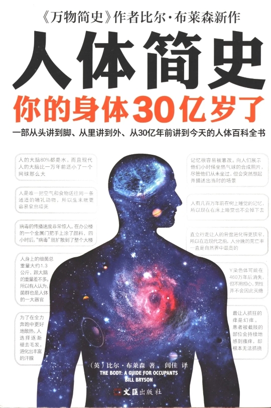 爱因斯坦曾经说过,这个宇宙最伟大最神奇的事情,就是人可以仅透过思考,就能理解这个宇宙。但是,对于如宇宙一样的人体,我们自己虽长期居住于此,却知之甚少。读了比尔•布莱森的新著《人体简史》后,这种感受更加突出。