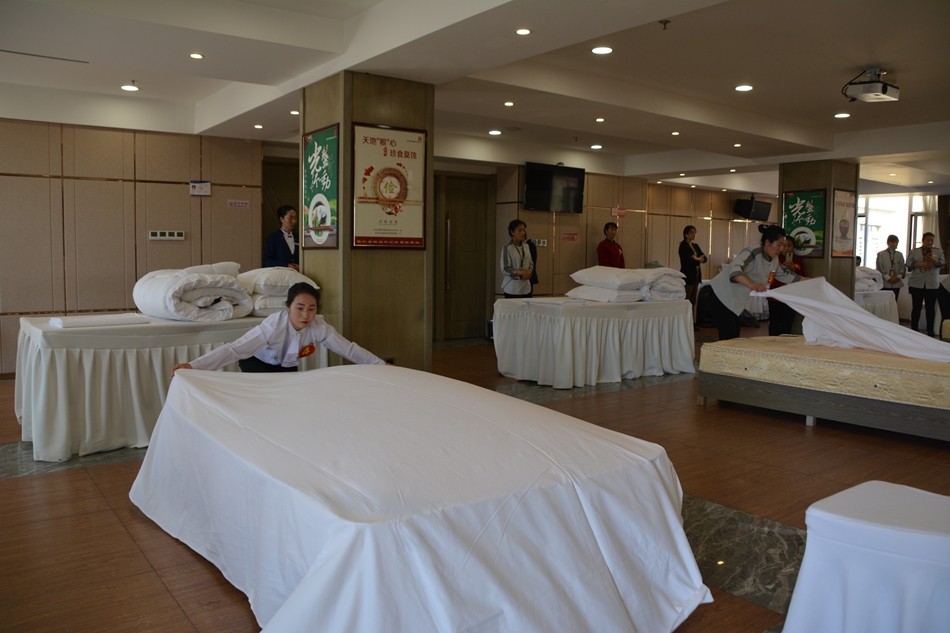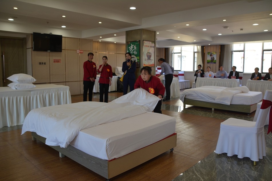 竞赛现场,各参赛选手动作规范、技术娴熟,每一个程序都认真操作、井然有序,以良好的专业精神展现了清水宾馆酒店从业人员的综合素质和精湛技艺,赢得在场评委的充分肯定。