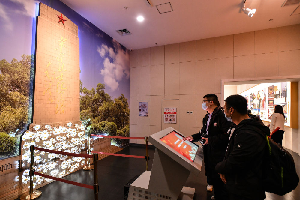 ↑2021年4月2日,参观者在山东济南战役纪念馆内学习党史、缅怀先烈。