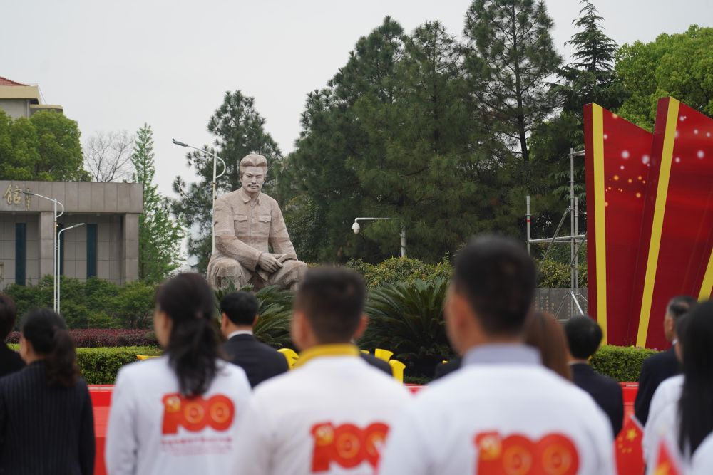 ↑2021年4月2日,人们在江西省南昌市方志敏广场参加纪念活动,缅怀先烈,开展党史学习教育。