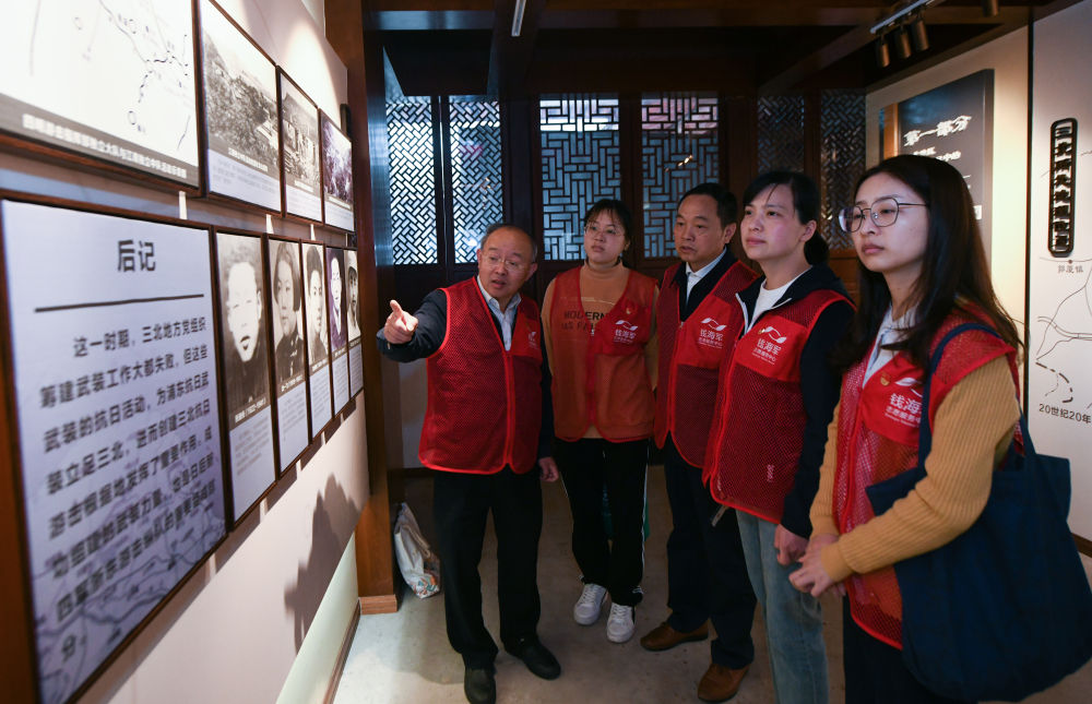 ↑2021年4月23日,浙江慈溪市钱海军志愿服务中心党支部的党员在浙东抗日根据地旧址参观学习。