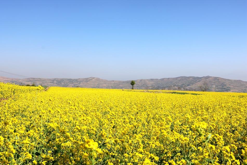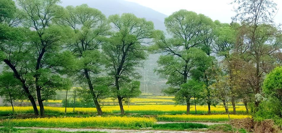 从县城出发,伴着柔风暖阳一路向东,入洛礼路驱车大概十分钟就进入四门辖区了,公路两侧的白杨和侧柏在晨光里泛着绿波,此时远处零星的丁香花恰似落入凡尘的琼芳,让你心生欢喜。车窗外的微风夹着油菜花的香甜扑鼻而来,俗话说“占尽春光一抹黄,纷至沓来蜂蝶忙”,时下开得最盛最美的油菜花已经迫不及待的向你招手了。黄绿相间的花田里蜂飞蝶舞,嬉闹的孩童已将昨日的烦恼抛到九霄云外,扛着铁锹的大伯在田埂上望着这满眼金黄,仿佛看到更甜蜜的日子就要到来,风中摇曳的油菜花宛若千层波浪在碧海翻涌,一波潮来一波歌。