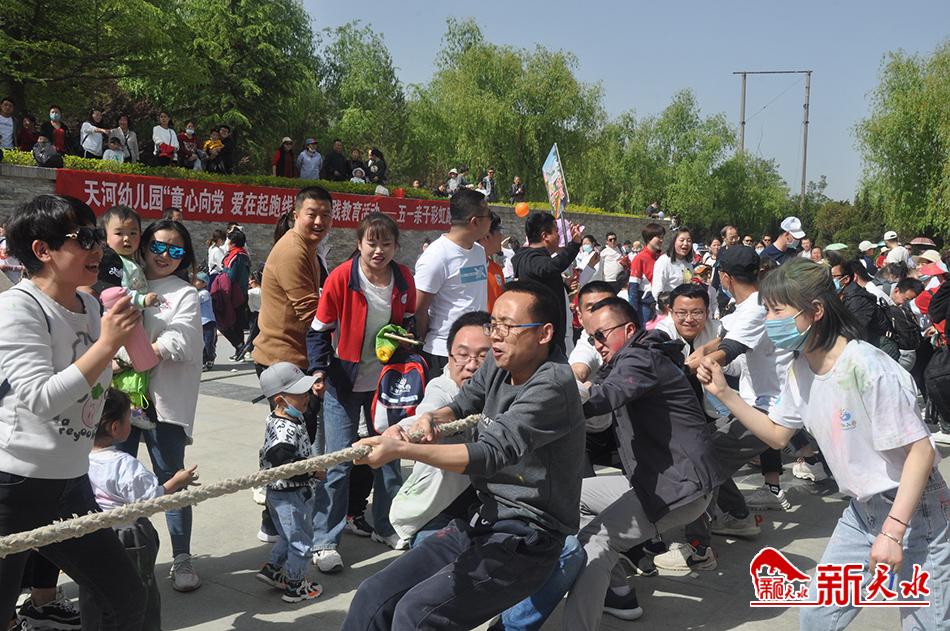 4月30日上午,天河幼儿园在秦州区牡丹园举办了喜迎建党100周年“童心向党,亲近自然,快乐成长”社会实践教育活动。活动中,400多名幼儿和家长、老师一起表演了“国家”“社会主义核心价值观”手语操、“爱让我们是一家”亲子舞等节目,并开展了拔河比赛、”五一“亲子彩虹跑等活动。□新天水记者 徐强 摄
