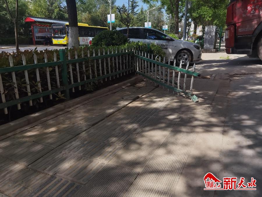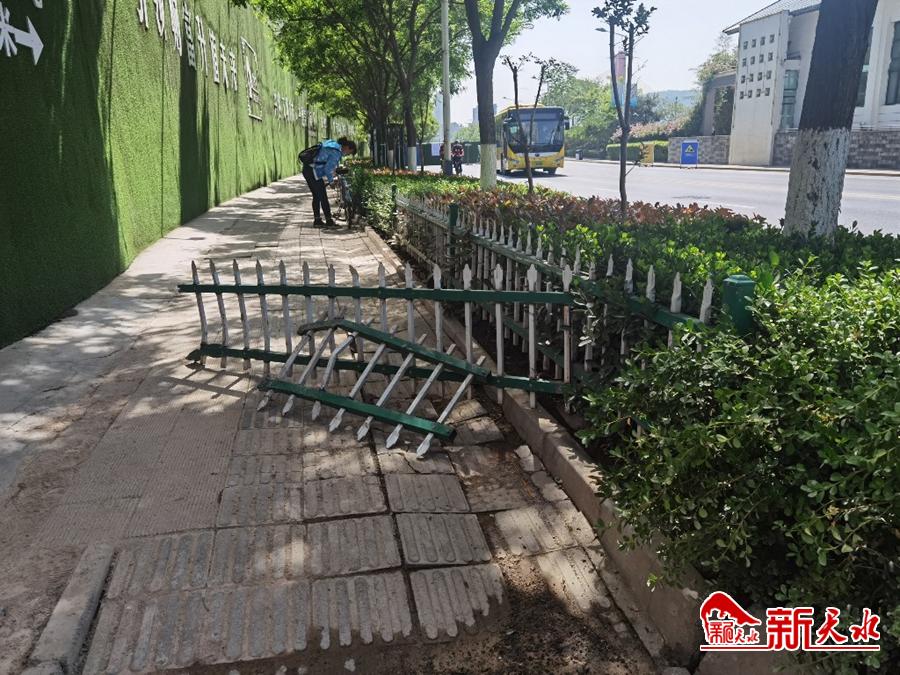 5月8日,在秦州区藉河北路藉滨桥北附近,绿化带隔离栏断裂并被移放在人行道上,影响行人通行。【冰帆摄】