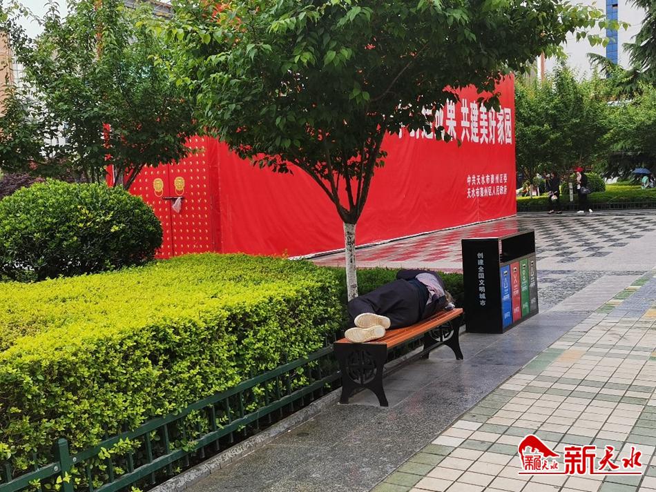 5月25日,在龙城广场附近,一位老人把座椅当成了躺椅,直接躺在上面休息。希望市民能够自觉遵守公共场所的文明规范,不要只顾及自己舒服而忽视他人需要。(夏雨 摄)
