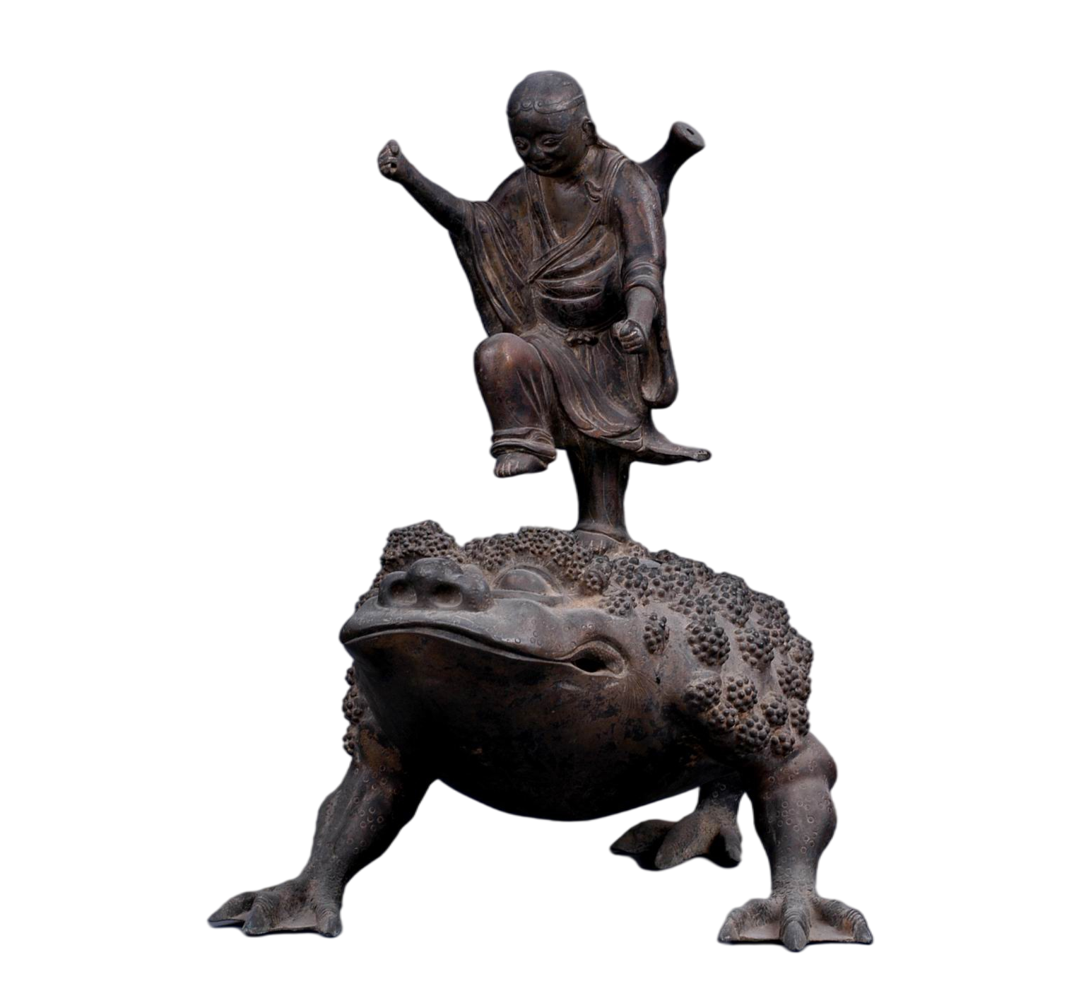 天水市博物馆收藏,明代,高41.5厘米,宽36厘米。蟾为三足,每足三趾,趾间有蹼,突眼大鼻,方口微闭,通身为蟾蜍瘤纹,蟾蜍空腹,背部有盖,盖上刘海身背宝瓶,右臂上举,左手握拳下垂,身微前倾,右腿弓起,左脚站立于蟾背。蟾人可分离。