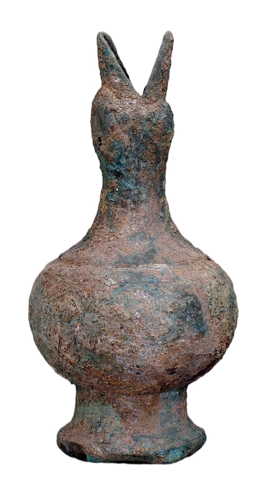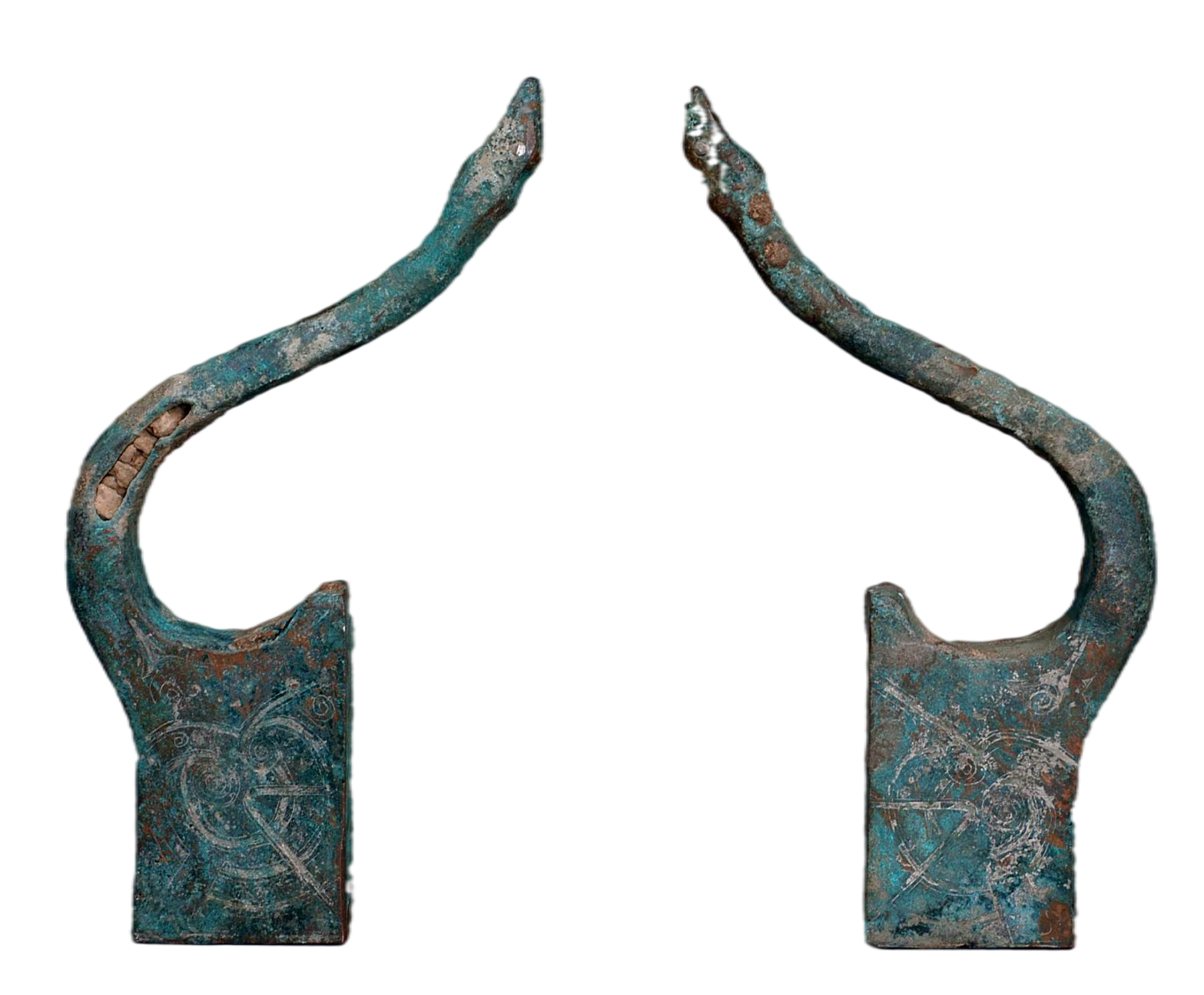 收藏于天水市博物馆,战国时期,长24.20厘米,宽5.80厘米,厚2.90厘米。该器一组(两件),大小相同,头部为鸟形,颈细长而弯曲,柄部中空,可插入木楔,柄部一侧有不规则涡纹、曲线纹及弦纹组成的错银云纹图案,鸟头部眼睛亦为铜错银。