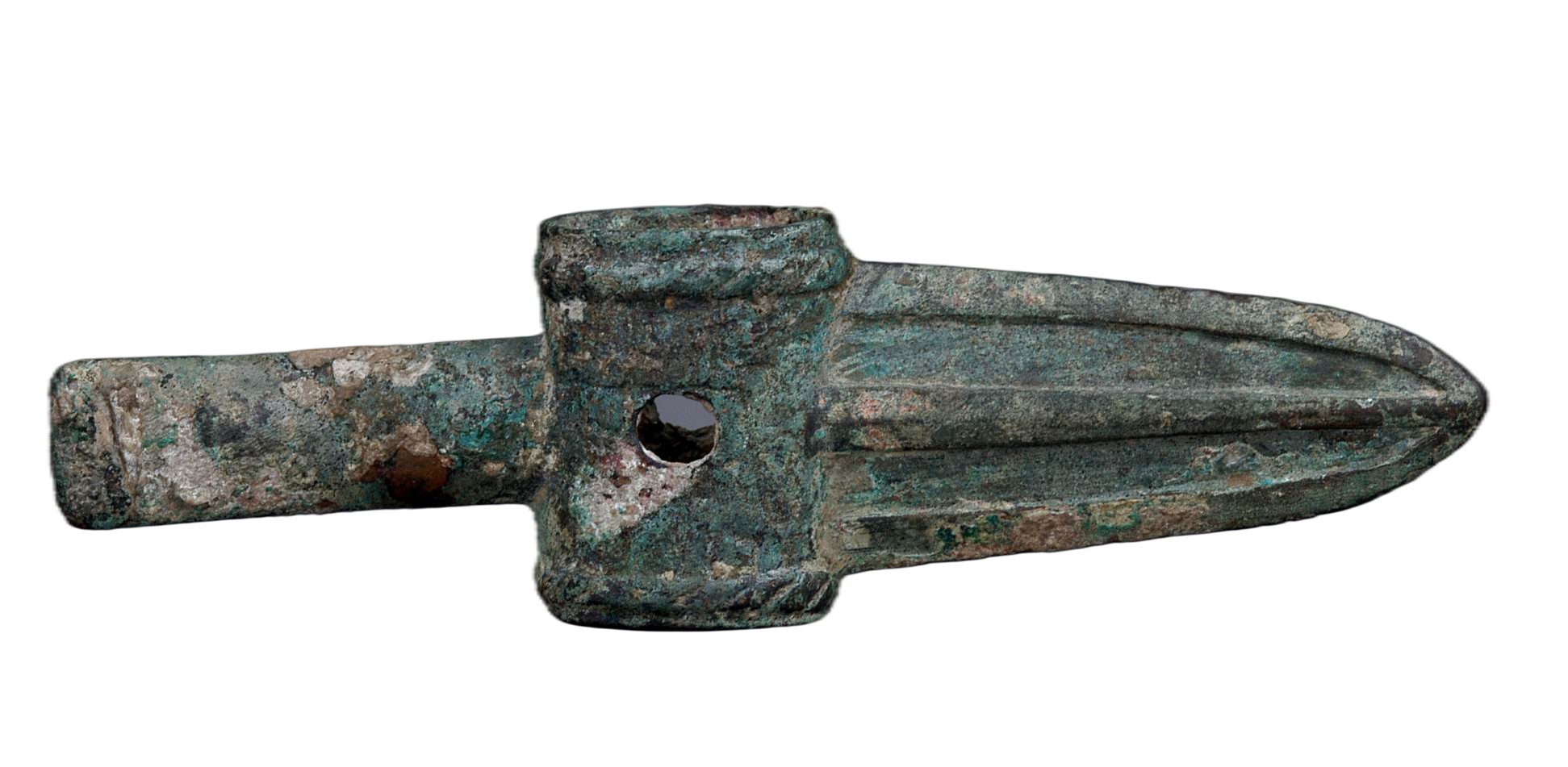 天水市博物馆收藏,春秋时期,长15.20厘米,宽4.00厘米。该器物为柳叶形,体短有脊,较厚,援部有銎管,可纳柲,内后端有阙口,援后部有几何纹饰。