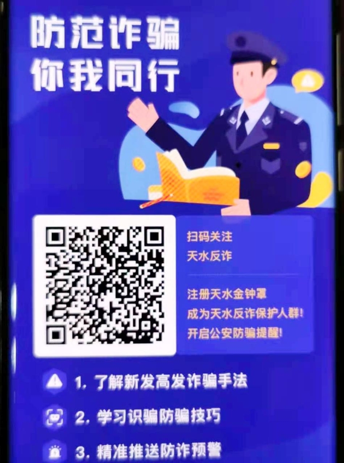 为了坚决遏制电信网络新型违法犯罪高发多发态势,切实保障广大人民群众财产安全和切身利益,6月1日,天水市公安局联合抖音平台启动“平安天水 全民反诈”抖音宣传月活动,由天水公安发起的抖音话题#天水全民反诈#正式上线,大家可以分享反诈技巧和故事。随后在各县区举行线下宣传活动,用户关注“天水公安”抖音官方账号即可领取反诈礼品。