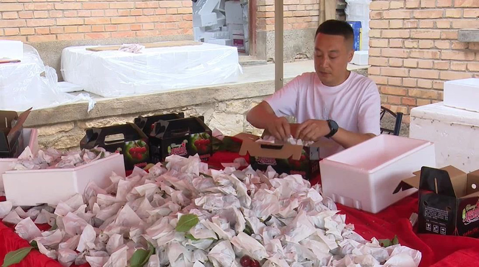 杜沐露是红卫村的大樱桃销售冠军,他每日穿梭于村里的各个果园,帮助村民销售大樱桃,手机和网络成了他的新“农具”,天南地北的客户都通过网络和手机找他发樱桃。杜沐露说:“我通过这十几年线上线下的樱桃销售,目前订单量比较大 ,每天可以销售2000多斤,400来箱。我家里种植了10多亩的樱桃,供不应求,我便把咱们村果农的樱桃收购过来,经过再次分拣包装后销售。我给咱们村民的收购价格也比较高,村民们也非常高兴。”